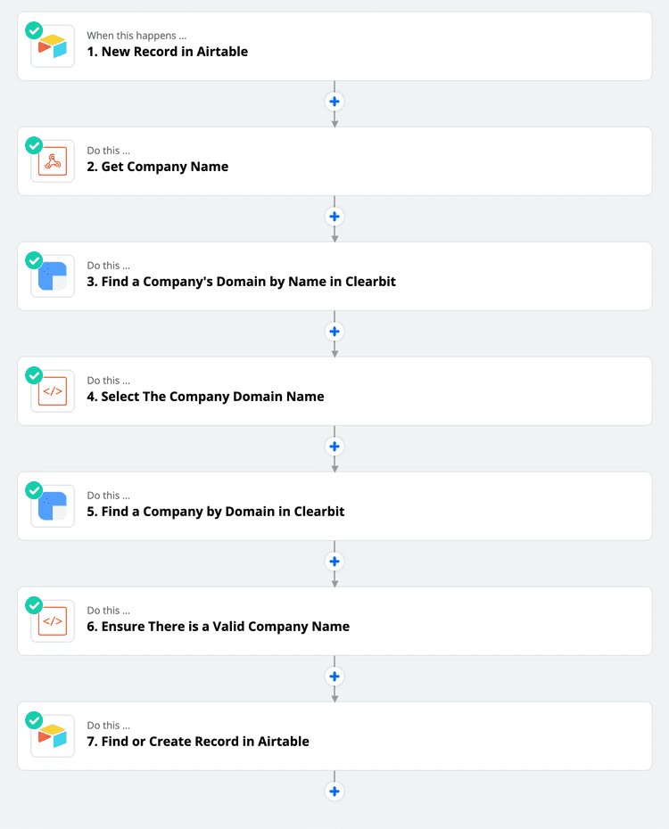 With each job listing, we also get the name of the company that posted the job along with the domain for the company. This is quite limited, so in order to really get quality leads, we have to enrich the company information. The workflow here is: